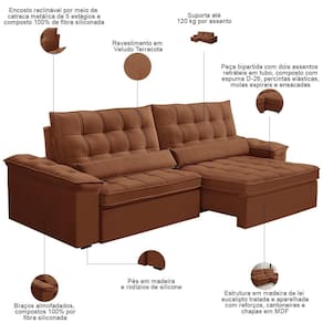 Unidades por kit: 1 | Cor: Terracota | Requer montagem: Não | Tipo de produto: Sofá Retrátil Reclinável | Peso máximo suportado: 240 kg | Peso: 110 kg | Orientação do Sofá: Frontal | Mecanismo de abertura do produto: Manual, rodízios de silicone | Material do estofamento: Veludo | Material de enchimento do encosto: Fibra Siliconada | Linha: Sala de Estar | Estilo: Moderno | Formato do sofá: Linear | Desenho do tecido: Liso | Densidade da espuma do assento: D-26 | Cor dos pés: Marrom | Fabricante: Lyam Decor | Profundidade: 121 cm | Altura: 110 cm | Largura: 290 cm | Quantidade de Caixas de embalagem: 2