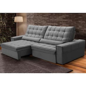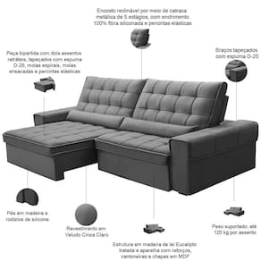 Mecanismo de abertura do produto: Manual, rodízios de silicone | Orientação do Sofá: Frontal | Fabricante: Lyam Decor | Requer montagem: Não | Tipo de produto: Sofá Retrátil Reclinável | Peso: 110 kg | Densidade da espuma do assento: D-26 | Cor dos pés: Marrom | Cor: Cinza claro | Peso máximo suportado: 240 kg | Material de enchimento do encosto: Fibra Siliconada | Altura: 115 cm | Largura: 290 cm | Material do estofamento: Veludo | Unidades por kit: 1 | Estilo: Moderno | Linha: Sala de Estar | Desenho do tecido: Liso | Profundidade: 121 cm | Quantidade de Caixas de embalagem: 2 | Formato do sofá: Linear