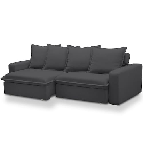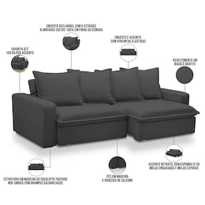 Encosto reclinável por meio de catraca metálica com 5 estágios e almofadas soltas 100% em fibra siliconada.
