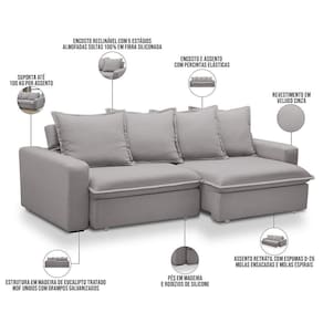 Encosto reclinável por meio de catraca metálica com 5 estágios e almofadas soltas 100% em fibra siliconada.