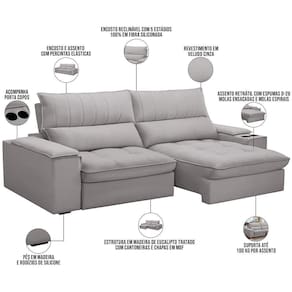 Altura: 115 cm | Color: Cinza | ColorFamily: Cinza | ColorSimple: Cinza | ColorSupplier: Cinza | Cor: Cinza | Cor dos pés: -1 | Densidade da espuma do assento: D-26 | Desenho do tecido: Liso | Estilo: Moderno | Fabricante: Lyam Decor | Formato do sofá: Linear | Largura: 230 cm | Linha: Sala de Estar, Living | Material: Madeira de lei (Eucalipto) devidamente tratada e aparelhada com reforços e cantoneiras e chapas em M | Material de enchimento do encosto: 100% de Fibra Siliconada | Material do estofamento: Veludo | MaterialFamily: Tecido, Madeira | Mecanismo de abertura do produto: -1 | Model: Nápoles | Orientação do Sofá: -1 | OriginCountry: Nacional | OriginState: PR | Peso: 75 Kg | Peso máximo suportado: 100 kg | ProductContents: 01 Sofá | ProductHeight: 230 cm | ProductInstructions: Produto para uso em ambiente interno, nao devendo ficar exposto ao sol, calor e umidade excessivos. | ProductLength: 110 cm | ProductWarranty: 90 dias após o recebimento do produto | ProductWeight: 75 kg | ProductWidth: 115 cm | Profundidade: 110 cm | Quantidade de Caixas de embalagem: 1 | Requer montagem: Não | SizeDescription: Altura: 115 cm x Largura: 230 cm x Profundidade: 95 cm | SupplierSimpleName: Sofá Retrátil Reclinável Para Sala de Estar Living 230cm Nápoles F04 Veludo Cinza - Lyam Decor | Tipo de produto: Sofá | Unidades por kit: 1