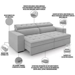 Dono de um visual que promete levar sofisticação e aconchego para a sua casa, o Sofá Retrátil Reclinável Para Sala de Estar Living 290cm Clara, da Lyam Decor, vai transformar os seus dias de descanso, além de elevar a decoração da sala de estar. Por dentro, esse sofá conta com estrutura em madeira de reflorestamento de eucalipto, responsável pela grande durabilidade e resistência, enquanto as percintas elásticas, as molas espirais e ensacadas e a tapeçaria em espuma D-26 garantem o conforto e maciez inigualáveis. Já a versatilidade fica por conta do assento retrátil e do encosto reclinável, o que permitem adequar a posição o sofá de acordo com sua necessidade, seja fechado para receber os amigos, ou aberto e reclinado para curtir aquele filme em família.E aí, bom demais, não é mesmo? Então, aproveite e garanta já o seu!