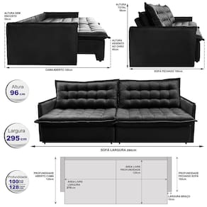 Sofá Sem Caixa Retrátil Reclinável 2,95m Cama inBox Versátil. com Pillow Top e Molas Velusoft - Preto