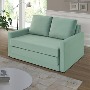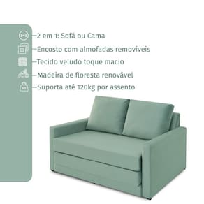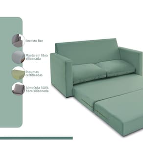 Assentos com espuma flexível de poliuretano densidade 26kg/m, certificada, fabricação própria. Com assento dobráveis, ela abre totalmente virando uma cama. Enchimento do encosto: espuma D-26 e fibra de poliéster siliconada. Estrutura de madeira maciça de pinus e eucalipto 100% reflorestada. Fixação da estrutura: grampos galvanizados anti-ferrugem. Apoiados no chão com sapatas de pvc. Revestimento/tecido: veludo 100% poliéster, com toque macio.
