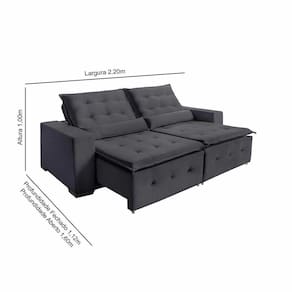 Medidas do Produto:Altura: 1,05mtCumprimento fechado: 1,25cmCumprimento aberto: 1,60cmLargura: 2,20cmInformações Extras:Peso suportado: 120kg por pessoaGarantia: 3 mesesFabricante: De casa décor e estofadosInformações Importantes:- OS TECIDOS PODEM SOFRER ALTERAÇÕES DE TONALIDADES DEPENDENDO DO LOTE DE PRODUÇÃO E TAMBÉM DA RESOLUÇÃO DA TELA DO SEU MONITOR/CELULAR.- Os objetos que ambientam as fotos não acompanham o produto.
