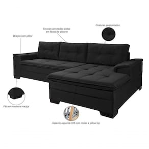 Cor: Preto | Altura: 92 | Peso do Produto: 40 | Garantia do Fabricante: 3 | Tonalidade: Preto | Cômodo Indicado: Salas | Produto: Sofá | Tipo de Tecido: Suede | Quantidade de Lugares: 3 | Complexidade de Montagem: Baixa: pode ser montado por uma pessoa leiga | Conservação e Manutenção do Produto: Não utilizar produtos químicos | Largura: 87 | Tipo do Sofá: com Chaise | Capacidade de Peso: 300 | Tempo Estimado de Montagem: 5 | Comprimento: 260 | Assento Retrátil: Não Retrátil Cor: Preto 381