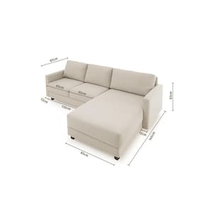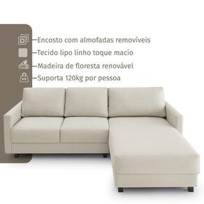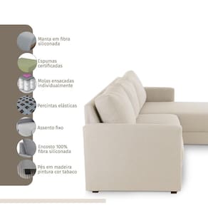 Assentos com espuma flexível de poliuretano densidade 26kg/m, certificada, fabricação própria, coladas sobre molas ensacadas, sustentados por persintas elásticas. Enchimento do encosto: fibra siliconada. Estrutura de madeira maciça de pinus e eucalipto 100% reflorestada. Fixação da estrutura: grampos galvanizados anti-ferrugem. Apoiados no chão com pés de madeira 8cm. Revestimento/tecido: linho 100% poliéster, com toque macio.