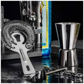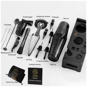 UM CONJUNTO COMPLETO PARA MISTURAR Conjunto de ferramentas de bar de 24 peças de acessórios de bartender de alta qualidade. Com nosso livreto de receitas especiais, não importa se você já fez coquetéis sozinho, agora você pode experimentá lo sem hesitação seria sempre uma boa escolha Hora de compartilhar sua própria bebida com seus amigos e familiares METARIAL DE ALTA QUALIDADE Alta resistência à abrasão e à prova de ferrugem. Todos os acessórios são feitos de SS304 e SS430. Qualidade superior garantida UM PRESENTE PERFEITO E ÚNICO O kit de bn Soing seria um presente maravilhoso para seus amigos e familiares, seja aniversário, casamento, aniversário ou natal. Com nossa caixa de presente elegante, acreditamos que eles vão adorar seu presente FÁCIL DE LIMPAR E ZENAR Com nosso suporte específico, você não precisa mais se preocupar em perder acessórios de coqueteleira. Ele pode não apenas zenar bem suas ferramentas de barra, mas também pode ser como um belo ornamento Para evitar arranhar a superfície do seu conjunto de barras, recomendamos lavar as mãos