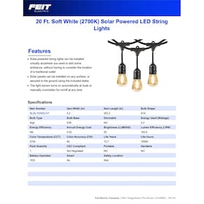- FÁCIL INSTALAÇÃO: Não há necessidade de ferramentas especiais ou conhecimentos. Basta pendurar as luzes no local desejado usando os clipes ou ganchos incluídos e posicionar o painel solar para máxima exposição ao sol. A Feit Electric Co. oferece produtos de alta qualidade e está comprometida em garantir total satisfação do cliente. Compre com confiança!
