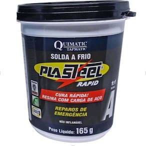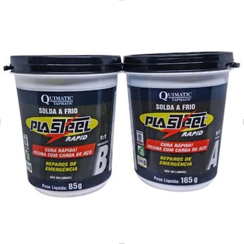 Massa epóxi bi componente com carga de aço na composição. Possibilita uso em locais com restrição ao uso de solda convencional. Usinável com excelente precisão dimensional. Utilizado em tubulações e flanges para estancar vazamentos, rachaduras, trincas e componentes mecânicos com desgaste. Resina reforçada com carga de aço e com excelente adesão em superfícies rígidas. Resistente a choques térmicos e temperatura constante de até 90°C ou picos de 120°C. Cura em 5 minutos. Fácil mistura devida sua proporção de 1:1 em volume. Massa consistente, pronto para aplicação. Medida componente A: 0,165kg Medida componente B: 0,085kg Peso: 250g Marca: Tapmatic Modelo: Plasteel Rapid SKU: 25259