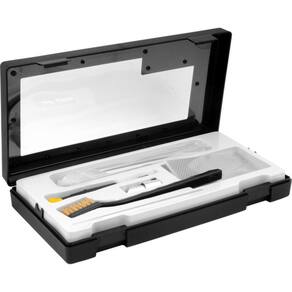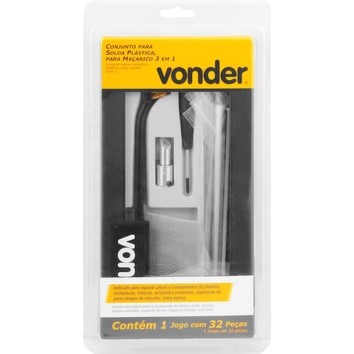 Ref. Fornecedor:7442033000marca:vonderconteúdo da embalagem:1 Conjunto para solda plástica. Composto por: 1 estojo plástico, 1 ponteira de alumínio, 1 chave phillips, 1 escova para limpeza com cerdas de latão, 1 haste com ponta recartilhada para limpeza, 3 telas/malhas de aço, 3 varetas ABS pretas, 3 varetas ABS brancas, 3 varetas polietileno PE pretas, 3 varetas polietileno PE brancas, 3 varetas poliestireno PS pretas, 3 varetas poliestireno PS brancas, 3 varetas polipropileno PP pretas e 3 varetas polipropileno PP brancas.Destaques e diferenciais:Possui estojo plástico que facilita a acomodação e organização do conjuntoAplicações e dicas de uso:Utilizado com o Maçarico Manual Portátil 3 em 1 VONDER, código 72.99.301.000. Indicado para reparar peças e componentes de plástico, rachaduras, fraturas, arranhões profundos, reparação de para-choque de veículos, entre outros. Características Técnicas:Dimensões do estojo: 275 mm x 138 mm x 40 mm Massa aproximada Kg : 350 g Marca: Não Informado