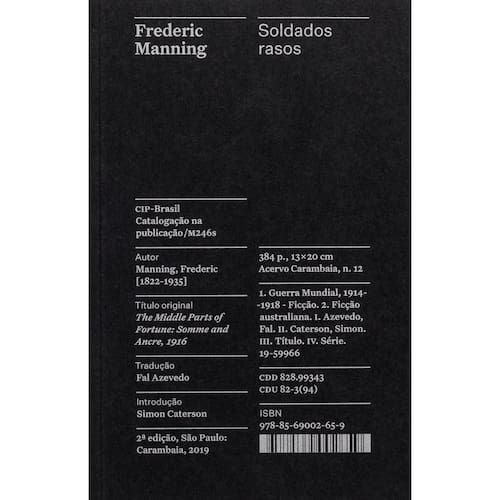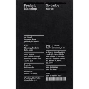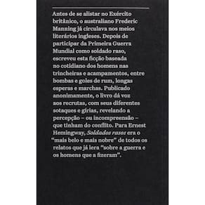 "Soldados rasos", inédito no Brasil, foi publicado pela primeira vez na Inglaterra em 1929, em uma edição com tiragem reduzida e, no ano seguinte, em maior tiragem, mas numa versão com cortes, livre de palavrões e demais expressões consideradas chocantes para a época. O livro, que logo chamou atenção pela qualidade literária do relato de guerra, foi publicado anonimamente. Vinha apenas com a assinatura “Soldado 19022”. Leitores intrigados com a autoria do texto acabaram descobrindo que quem estava por trás daquelas linhas era o escritor australiano Frederic Manning (1882-1935). O pseudônimo referia-se à identificação militar que recebeu quando lutou pela Inglaterra durante a Primeira Guerra Mundial. Conhecido nos círculos literários da Inglaterra, onde vivia, Manning alistou-se voluntariamente no exército britânico e lutou, ao lado de soldados de diversas nacionalidades, nas ofensivas franco-britânicas contra os alemães na região do vale dos rios Somme e Ancre, na França, durante o segundo semestre de 1916. Seu livro é uma ficção baseada no cotidiano dos homens nas trincheiras e acampamentos, entre bombas e goles de rum, longas esperas e marchas. Manning dá voz aos soldados anônimos, com seus diferentes sotaques e gírias, revelando a percepção – ou incompreensão – que tinham do conflito. O sucesso do livro na Inglaterra fez autores e críticos investigarem a identidade do Soldado 19022. Foi T. E. Lawrence, apreciador da escrita de Manning e que considerava a obra “o livro dos livros” sobre o exército britânico, quem a desvendou e forçou o autor a sair do anonimato. Cultuado por escritores como Ezra Pound, T. S. Eliot ou E. M. Forster, "Soldados rasos" só foi relançado em sua versão completa na Inglaterra no final dos anos 1970. Essa foi a edição usada como base para a primeira tradução da obra para o português. Ernest Hemingway declarou certa vez que considerava o livro de Manning como o “mais belo e mais nobre” de todos os que já lera “sobre a guerra e os homens que a fizeram”. “Eu o releio a cada ano, para me lembrar de como as coisas realmente eram, para não ter nunca de mentir – a mim mesmo ou aos outros – sobre o que foi essa realidade”, disse.