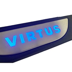 A soleira de aço inox Escovado tem a função de proteger o pisante do seu Virtus ao embarcar ou desembarcar do mesmo, além de proporcionar visual esportivo com grafia personalizada em LED com o nome do Veículo.