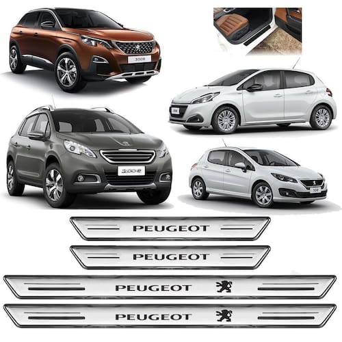 Kit com 4 Soleiras Resinadas para a linha Peugeot Contem: - Duas 2 soleiras Grandes para a porta Dianteira. - Duas 2 soleiras Pequenas para a porta Traseira. Referência: sp173 Cor: Prata Comprimento: 46 cm / 23,5 cm Largura: 3 cm todos Espessura: 0,5 cm todos Aplicação: Autocolante fita inclusa