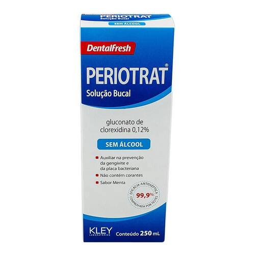 Solução Bucal Periotrat Menta Sem Álcool 250 Ml Solução bucal periotrat é indicado para eliminar os microorganismos que causam a placa bacteriana, a gengivite e o mau hálito. Indicado quando a limpeza mecânica dos dentes escovação não é possível ou indicada. Modo de usar: Bochechar o conteúdo de uma tampa 20 ml da solução sem diluir por 30 a 45 segundos pela manhã e a noite. não ingerir ou fazer bochechos com água ou outros líquidos após o uso do produto. Precauções e advertências: Usar somente em bochechos. usar somente sob recomendações do dentista. podem ocorrer manchas nos dentes e em restaurações observáveis após o uso do produto por longos períodos. este tempo varia de pessoa para pessoa. estas manchas são externas e podem facilmente ser removidas com profilaxia profissional. pode ocorrer perda temporária de paladar que retorna após interrupção do uso. Manter fora do alcance de crianças. Registro m.s.: 25351.575993/2012-19 Ean: 7896331705140