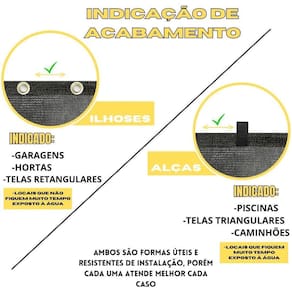 Características da tela de sombreamento: Tela com proteção u.V. Produto permeável e maleável. Fabricado com polietileno de alta densidade e matéria-prima 100% virgem, leve e possui alta resistência à tensão, compressão e tração. Bloqueia até 80% de raios uv. São leves e resistentes, fácil manuseio, transporte e instalação. Acabamentos nas laterais bainha e ilhós a cada 50 cm aproximadamente e alças nas extremidades.