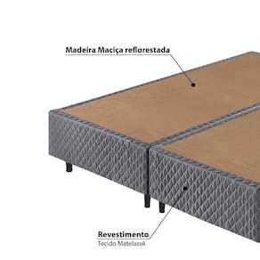 Sommier King Size Eco 193x203x40cm - CinzaA melhor escolha para complementar a sua cama box, além de ser lindo, traz um charme inigualável O Sommier Eco foi desenvolvido pensando no seu descanso e na qualidade do seu sonho. Conjunto resistente e firme, para colchões de tamanho King Size (não incluso). Tem pés fixos com 15cm de altura cada, é todo produzido em madeira reflorestada e o revestimento fica por conta de um lindo tecido plano.Madeira MaciçaUma opção excelente para quem procura móveis atraentes, requintados, únicos e com sofisticação. Esse tipo de móvel é sinônimo de qualidade e longa vida útil e, em um momento em que a sustentabilidade está em pauta, os móveis de madeira maciça podem ser uma boa alternativa ecológica, devido ao seu bom manejo e o benefício da reutilização. Assim, além de economia e exclusividade na decoração, um ambiente decorado com móveis de madeira maciça é, também, sinônimo de cuidado com o meio ambiente. A madeira maciça oferece mais resistência ao desgaste natural do tempo e maior durabilidade, por causa de suas características naturais e maior resistência à água do que móveis em MDP, ou móveis em MDF.Garantia03 meses para defeitos de fábricaCaracterísticas- Cinza- Estrutura: Madeira Reflorestada- Revestimento: Tecido Matelassê- 2 Peças- Para colchão Queen Size 193x203 cm (não incluso)- Pés Fixos com altura de 15cm na cor Tabaco- Entregue montado- Marca: EcoflexDimensões de cada boxPeso: 21,91 kgAltura com os pés: 40 cmLargura: 96 cmProfundidade: 203 cmOutras Informações- Montagem não inclusa.- Na limpeza não utilizar produtos químicos e abrasivos, usar apenas um pano umedecido, para garantir a maior durabilidade do móvel.- Os objetos que ambientam as fotos não acompanham o produto.- Imagens meramente ilustrativas. Cores e tonalidades podem variar.- Antes de comprar o seu produto verifique as medidas, o local onde pretende instalar e se é necessário contratar o serviço de um profissional qualificado.