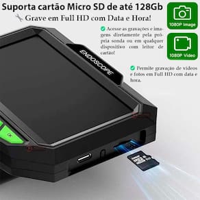 O kit acompanha um cartão micro SD de 64GB, oferecendo praticidade e espaço ideal para armazenar fotos e vídeos de inspeções técnicas com eficiência. A sonda é compatível com cartões micro SD de até 128GB, permitindo ampliar a capacidade de armazenamento conforme a demanda. É possível registrar imagens em três resoluções (1080p, 720p e 480p), ajustando a qualidade conforme a necessidade de espaço. A navegação e o gerenciamento dos arquivos podem ser feitos diretamente na própria sonda, com visualização e exclusão de conteúdos pela tela integrada. Para análises mais detalhadas, basta remover o cartão e inseri-lo em um notebook, PC ou outro dispositivo compatível com leitura de micro SD.