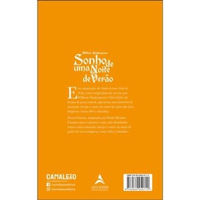 Esta adaptação de Sonho de uma Noite de Verão, texto originalmente escrito por William Shakespeare (1564-1616) em forma de peça teatral, apresenta uma história de amizade, inveja e amor no meio de ações de seres mágicos, como elfos e duendes. Com adaptação de Paulo Mendes Campos para o gênero conto e ilustrações de Ronaldo Barata, este clássico da história da literatura rico em linguagem visual atrai o leitor para as características de cada personagem, prendendo sua atenção até o desfecho da história. Marca: CAMALEAO EDITORA