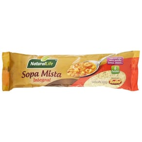 Ingredientes Condimento preparado para sopa, soja partida, proteína texturizada de soja, semente de linhaça triturada, aveia em flocos, lentilha, cenoura desidratada e macarrão. Contém glúten. Alérgicos: contém leite, trigo, soja e derivados. Informação nutricional porção de 50g 1 xícara Valor energético 17kcal=71kj 1% carboidratos 2,1g 1% proteínas 1,1g 1% gorduras totais 0,5g 0% gorduras saturadas 0g 0% gorduras trans 0g Fibra alimentar 1,0g 0% sódio 6,0mg 0% % valores diários de referência com base em uma dieta de 2.000 kcal ou 8.400 kj. Seus valores diários podem ser maiores ou menores dependendo de suas necessidades energéticas. Marca: Não Informado Ean: 17896256040934