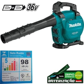 Soprador de folhas a bateria 36v 18v+18v dub363zv makita Características2 em 1: soprador e aspiradorIdeal para varrição e limpeza em condomínios, hotéis, resorts e espaços públicos, fabricas, telhados, etcNa função aspiração os detritos são triturados para diminuir o volume depositados no coletorResistente à água e poeira com a tecnologia xptMaior autonomia e desempenho das baterias com o motor bl2x mais desempenho operacional com a tecnologia 36v 18v + 18v Velocidade variávelControle eletrônico de velocidadePartida suaveCódigo/ modelo: dub363zvMarca: makitaEspecificações técnicasVolume máximo de ar: 13.4mminVelocidade máxima do ar: 65msRotações por minuto: 0 - 7.850Capacidade do coletor: 50lNível de pressão sonora: 84.8db a Nível de potência sonora: 98db a Dimensões c x l x a - com bico longo: 737786836 x 193 x 415mm- com bocal de vácuo: 1.396 x 604 x 415mmPeso: 6.6kgBateria: 18v - não inclusoEan: 088381889773 Itens inclusos1 - bolsa / reservatório;1 - cinto de ombro;2 - tubos;3 - pontas. Não acompanham bateria e carregador, esta versão é recomendada para quem já possui ferramenta a bateria da linha 18v lxt. Carregador e baterias recomendáveis:Carregador dc18rc - 197522-0 bivoltCarregador dc18sd - 197934-7 bivolt / carga rápidaCarregador duplo 127v dc18rd - 196928-9Carregador duplo 220v dc18rd - 196937-8Bateria 6.0ah bl1860b - 197422-4Bateria 5.0ah bl1850b - 197280-8Bateria 4.0ah bl1840b - 197265-4Bateria 3.0ah bl1830b - 197599-5Imagens meramente ilustrativas.Todas as informações divulgadas são de responsabilidade do fabricante/fornecedor