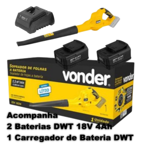 Conteúdo da Embalagem : Produto composto de 1pç Soprador de folhas 18V ISV1834 + 2 Baterias 18V lítio 4 Ah IBD 1804 DWT linha intercambiável + 1pç Carregador de Bateria DWT Garantia legal: 90 dias + Garantia contratual: 9 meses (Para locadoras, garantia única e exclusiva de 90 dias)