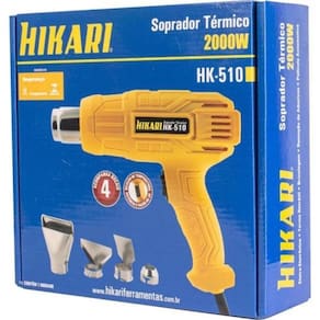 O Soprador Térmico HK-510 Hikari é uma ferramenta que produz ar quente para diversas aplicações. Indicado para profissionais que trabalham com aplicação de películas, remoção de adesivos, modelagem rápida de canos de PVC, termo encolhimento em protetores de cabos, secagem rápida e remoção de tintas, artesanatos, atividades relacionadas à moldagem de materiais plásticos e muito mais.
