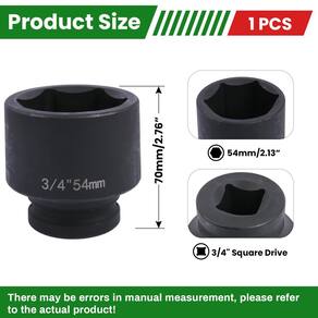 IMPORTANTE: Se for um produto elétrico, ele pode ser compatível com uma tomada de 110 volts. Se utilizado fora dos Estados Unidos, pode ser necessário um conversor de voltagem para garantir a operação adequada. Verifique se o produto que você está comprando é elétrico antes de considerar essas informações. Soquete de impacto de 54 mm com acionamento de 3/4" YtkAvq, soquetes de impacto padrão de 6 pontos feitos com liga de aço cromo-molibdênio, métrico -?Tamanho - Unidade?: 3/4 polegadas, tamanho do soquete de 6 pontos: 54 mm, comprimento total: 70 mm/2,76 polegadas. As especificações estão claramente marcadas na superfície do soquete, o que é fácil de identificar e melhora a eficiência do trabalho. -?Construção durável em aço de alto carbono?: Feito de aço de alto carbono, este soquete de impacto é construído para suportar aplicações pesadas e de alto torque, oferecendo resistência e durabilidade superiores. -?Design preciso de 6 pontos?: O design do soquete de 6 pontos garante uma aderência segura aos fixadores, reduzindo o arredondamento e maximizando a transferência de torque para tarefas desafiadoras. -?Aplicações profissionais e industriais?: Perfeito para uso em reparos automotivos, manutenção industrial e trabalhos com máquinas pesadas, este soquete de impacto foi projetado para profissionais que exigem confiabilidade e desempenho. -?Acabamento resistente à corrosão?: O revestimento resistente à corrosão protege contra ferrugem, garantindo desempenho duradouro mesmo em ambientes de trabalho severos.