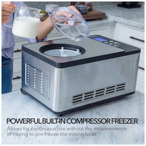 Sorveteira Whynter ICM 200LS com capacidade de 2,1 litros, carcaça de aço inoxidável, compressor embutido, temporizador, função de proteção do motor e painel de controle LCD.Bowl de congelamento