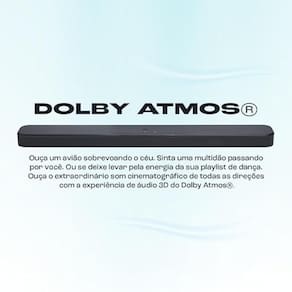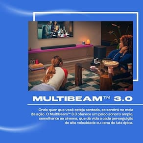 Compatível com HDMI ARC, possibilita integração simplificada com a TV e controle pelo próprio controle remoto da televisão, além de transmitir áudio com maior qualidade. Possui suporte a áudio digital multicanal para uma experiência mais imersiva.