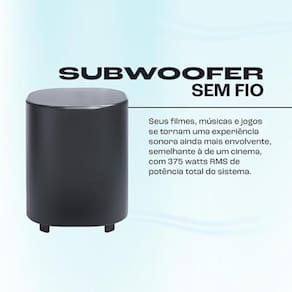 O sistema 2.1 canais oferece maior clareza nos diálogos e melhor separação de áudio. O subwoofer wireless reforça as frequências graves sem necessidade de cabos, facilitando a instalação e organização do ambiente.