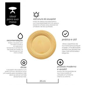 Além de sua função prática como apoio para pratos, este sousplat é uma peça de decoração por si só. Seu acabamento dourado confere um toque de glamour a qualquer configuração de mesa, seja para jantares formais ou encontros casuais.