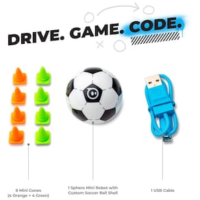 O Sphero Mini Soccer é um robô esférico inspirado em uma bola de futebol, programável e controlado via aplicativo Sphero Play, ideal para aprendizagem em STEM e diversão esportiva. Equipado com giroscópio, acelerômetro e luzes LED coloridas, o robô permite várias formas de controle, como joystick, slingshot, tilt e o exclusivo modo Kick Drive, que torna a experiência parecida com um jogo de futebol real. Acompanha 8 cones coloridos para criar circuitos e desafios criativos e educativos.