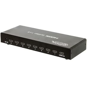 Splitter Hdmi 1x8 Saidas - Cirilo Cabos Distribua som e imagem FullHD para até 8 aparelhos televisores, monitores e projetores simultaneamente. Este Splitter 1x8 HDMI 3D é ideal para soluções em TI como: ambientes corporativos, conferências, apresentações, treinamentos, reuniões e aplicações em salões de eventos que necessitem de veiculação em diversas telas com a mesma imagem e som. Você pode ligar com simplicidade, sem necessidade de configuração o seu aparelho de DVD, Vídeo Game, Computador, Receiver de Tv a Cabo ou outros equipamento com saída HDMI. Especificações Imagem: Suporte 1080p com HDMI versão 1.4 e 3D Áudio: Suporte de Áudio sem compressão; Suporte Áudio Digital como DTS Digital, Dolby Digital incluindo DTS-HD e Dolby True HD ; Tamanho do aparelho: 27 x 13.5 x 2 cm Voltagem: Fonte de Alimentação Bivolt 110/220V - DC 5V / 3A Conteúdo da embalagem: - 1 x Splitter HDMI 1x8; - 1 x Fonte de Alimentação Bivolt; - 1 x Manual; Garantia: 3 meses Atenção: Verifique a compatibilidade com seu equipamento antes da compra, não nos responsabilizamos por incompatibilidades.