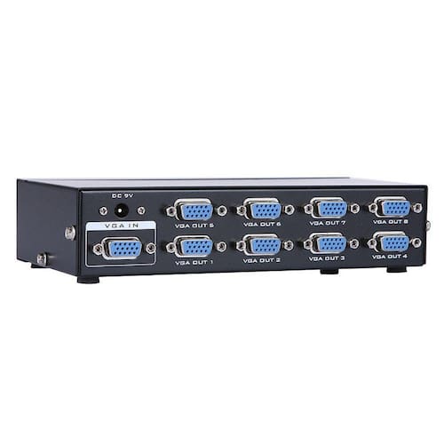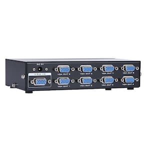 O splitter VGA é um dispositivo que amplifica e divide uma fonte VGA para vários equipamentos ou projetores de expansão VGA 1 vga input, 8 vga output Resolução 19200 x 1440 RGB largura de banda: 200mhz Power: DC 5V/1A Distância de transmissão: 25m