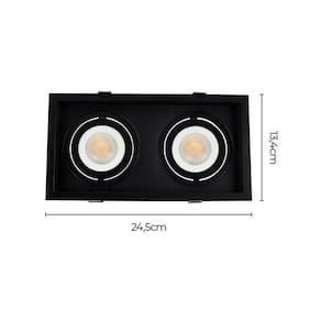 - Dimensões AxLxP (mm): 245x134- Material: Policarbonato- Garantia: 1 ano junto ao fabricante- Referência: 6333 (Branco); 6334 (Preto)- Grau de Proteção: IP 20- Lâmpada Inclusa: Não- Lâmpada Indicada: PAR20- Local de Uso: Interno- Número de Lâmpadas: 2- Soquete: E27- Nicho para Instalação: 230x120mm- Formato: Retangular- Direcionável: Sim- Frequência: 50/60 Hz- Voltagem: Bivolt- Recuado: Sim