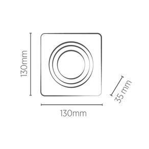 Especificações Gerais do Produto:Dimensões AxLxP (mm): 35x130x130Material: Termoplástico Proshield UVGarantia: 5 anos junto ao fabricanteGrau de Proteção: IP 20Lâmpada Inclusa: NãoLâmpada Indicada: AR70Local de Uso: InternoNúmero de Lâmpadas: 1Soquete: GU10Nicho para Instalação: 115x115x80*mm *a profundidade pode variar de acordo com a lâmpada utilizada.Formato: QuadradoVoltagem: BivoltFoco Orbital: 360Recuado: SimSistema Click: Substitui a lâmpada sem remover o embutidoObservação: Utilizar somente com lâmpada LEDCor: Branco
