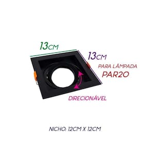 O Spot Conecta DL146PAR20, mede 13x13cm com nicho de instalação de 12x12cm e utiliza uma lâmpada PAR20, soquete E-27, com potência máxima de 50W.