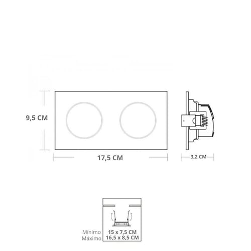 Spot Led Quadrado de Embutir Easy Duplo 10W Preto Bivolt Llum 6500K Luz Fria Características Gerais do Produto: Dimensões AxLxP CM : 17,5 X 9,5 X 3,2 Nicho do recorte CM : 16,5 X 8,5 Produzido em: Plástico de Engenharia, Alumínio, Placa de Circuito Impresso e Componentes Eletrônicos Voltagem: Autovolt em 110v e 220V Cor acabamento: Preto Potência: 10W Fluxo luminoso: 400 Lumens Eficiência luminosa: 80 Lm/W IRC: 80 Ângulo de abertura: 36 Para uso em soquete: LED já integrado, não se utiliza soquete Formato: Quadrado : 2 anos junto ao fabricante Aplicação: Embutir Vida útil: 25.000 horas Acompanha lâmpada: Não necessita, LED já integrado Cor da luz: 6500K Luz Fria Grau de proteção: IP40 Acompanha o produto: 01 Spot Led Completo 01 Kit Presilhas : 2 anos junto ao fabricante Marca: Não Informado