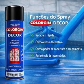 ATENCAOAs cores dos produtos podem sofrer variacoes em funcao das caracteristicas do monitor OBSERVACAO IMPORTANTEOs produtos podem sofrer alteracoes no design pelo fabricanteTodos os nossos produtos sao testados e filmados antes do envioConteudo da embalagem 01 unidade na embalagem Spray Decor Multiuso Colorgin 360ml Deixe sua criatividade fluir com o Spray Decor Multiuso da Colorgin. Formulado com resina acrilica de secagem rapida oferece excelente acabamento grande durabilidade e alto poder de cobertura garantindo preparacao eficiente da superficie antes da pintura final. Ideal para quem busca resistencia e praticidade possui otima aderencia e resistencia as intemperies podendo ser utilizado tanto em ambientes internos quanto externos. Indicado para aplicacao em superficies de metal como aco e ferro alem de madeira gesso e ceramica proporcionando base uniforme e melhor resultado no acabamento. Indicacao de usoMetal aco e ferroMadeiraGessoCeramicaAmbientes internos e externos AcabamentoFosco Rendimento aproximadoDe 1,6 m2 a 2,1 m2 por embalagemPode variar conforme tipo e condicao da superficie SecagemAo toque 30 minutosEntre demaos 2 a 3 minutosSecagem total 24 horas Conteudo da embalagem360 ml Diferenciais do produtoResina acrilica de secagem rapidaOtimo acabamentoGrande durabilidadeAlto poder de coberturaResistencia as intemperies