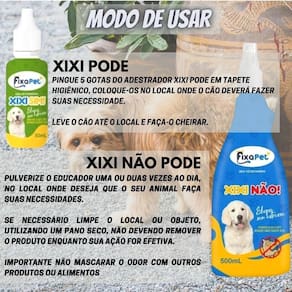 Spray educativa para xixi de pet 500 ML não pode e 30 ML pod Bem-vindo a Empresa PET ESTILOSO Kit Pet Educador Sanitário Cão Adestrador Xixi Não Pode 500 ml não pode e 30 ml pode Produto: Kit Pet Educador Sanitário Cão Adestrador Xixi Não Pode O Educador Sanitário foi desenvolvido para auxiliar no treinamento sanitário do seu animal. - O Xixi Não Pode, ajuda a manter distância dos objetos e locais que não devem fazer o xixi podendo ser utilizados em locais internos e externos . - O Xixi Pode é indicado para sinalizar e adestrar o local onde deve fazer o xixi. --- Kit composto por: --- - 01 educador sanitário Xixi Pode 30ml . - 01 educador sanitário Xixi Não Pode 500ml . - Composição: Mentil nonil cetona, essência, veículo .S.P. - Indicado para Cães XIXI NÃO PODE Modo de Usar: Ambientes internos e objetos: Pulverizar o educador NÃO PODE uma ou duas vezes ao dia, no local onde não se deseja que o seu animal faça suas necessidades. Se necessário limpe o local ou objeto, utilizando um pano seco, não devendo remover o produto enquanto a sua ação for efetiva. É importante não mascarar o odor com outros produtos ou alimentos. Nota: o animal deverá ser treinado todos os dias. XIXI PODE Pingue 5 gotas do adestrador Xixi Pode em tapete higiênico, coloque-os no local onde o cão deverá fazer suas necessidade. Leve o cão até o local e faça-o cheirar. ADVERTENCIA: - Conservar em local seco e fresco, ao abrigo da luz solar. - Manter fora do alcance de crianças e animais domésticos. - Não guarde ou aplique perto de alimentos, bebidas e medicamentos. - Em caso de contato com os olhos, lavar com água por 15 minutos. - Em caso de ingestão, procure imediatamente o Ceatox - Centro de Auxilio Toxicológico - 08000-148110 ou o serviço de saúde mais próximo, levando a embalagem ou rótulo do produto. - Produto declarado isento de registro conforme instrução normativa Nº 37 do Mapa -------------------------------------------- Marca: Não Informado Ean: 7792424874963