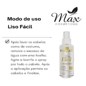 Spray finalizador liso fácil O liso fácil é um fluído termoativo condicionante em spray que ajuda na finalização de todos os tipos de cabelo. O fluído conta com o total de 20 benefícios que irão deixar os cabelos extraordinários entre eles: Sem parabeno; sem corante; proteção térmica; proteção solar; super brilho; maciez; anti frizz; protetor térmico; sela a cutícula capilar; perfuma os cabelos; hidrata os cabelos; blindagem; previne e melhora pontas duplas; reduz o volume do cabelo; repara danos; sem formol; cabelos mais leves; melhora os resultados da chapinha; suaviza os fios; reduz o ressecamento. Modo de uso Após lavar os cabelos como de costume, remova o excesso de água com uma toalha se preferir aplique um creme sem enxágue também. Agite o liso extremo e borrife o spray por todo o cabelo. Após a aplicação, penteie os cabelos e finalize e finalize utilizando chapinha, secador e/ou modelador de cachos. O liso fácil pode ser todas as vezes que for alisar os cabelos, pois através do calor, o produto é ativado. Anvisa 25351095902202108 Quantidade do kit 120 ml Marca: Não Informado