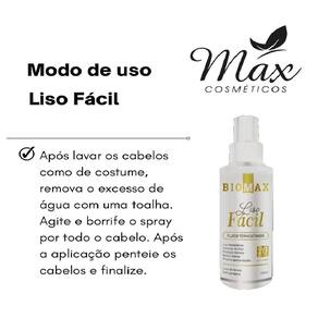O liso fácil é um fluído termoativo condicionante em spray que ajuda na finalização de todos os tipos de cabelo. O fluído conta com o total de 20 benefícios que irão deixar os cabelos extraordinários entre eles: Sem parabeno; sem corante; proteção térmica; proteção solar; super brilho; maciez; anti frizz; protetor térmico; sela a cutícula capilar; perfuma os cabelos; hidrata os cabelos; blindagem; previne e melhora pontas duplas; reduz o volume do cabelo; repara danos; sem formol; cabelos mais leves; melhora os resultados da chapinha; suaviza os fios; reduz o ressecamento. Modo de uso Após lavar os cabelos como de costume, remova o excesso de água com uma toalha se preferir aplique um creme sem enxágue também. Agite o liso extremo e borrife o spray por todo o cabelo. Após a aplicação, penteie os cabelos e finalize e finalize utilizando chapinha, secador e/ou modelador de cachos. O liso fácil pode ser todas as vezes que for alisar os cabelos, pois através do calor, o produto é ativado. Anvisa: 25351095902202108 Quantidade do kit: 120 ml Compatibilidade: compatível com qualquer produto ou química, pois ele é natural Indicação: para todas idades e tipos de cabelos, para manutenção diária ou cabelos muito danificados principalmente após tratamento químico Marca: Não Informado