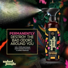 - Potente purificador de ar e spray eliminador de odores - Naked Jungle é um spray eliminador de odores à base de plantas, com patente pendente, que destrói permanentemente os odores em nível molecular. NÃO mascaramos o odor, nós o matamos na fonte. Basta agitar bem e pulverizar generosamente contra o odor ofensivo e o ar circundante para eliminar os cheiros repulsivos de forma completa e imediata.