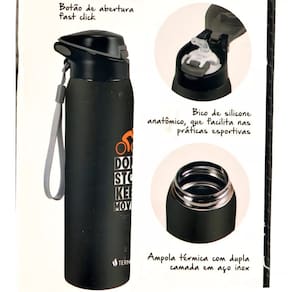 Produzido em aço inox de qualidade, que conserva as bebidas quentes e frias por muito mais tempo, 6h e 12h, respectivamente, o Squeeze Térmico Sport Fitness da Termopro combina com você! Durável e resistente, possui botão de abertura fast click, botão de silicone anatômico que facilita nas praticas esportivas e ampola térmica com dupla camada em aço inox. Também acompanha embalagem presenteável.