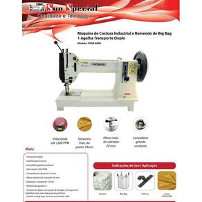 Máquina de costura industrial para fechamento, pregar alças e remendas de big bags, sacaria, rafia ou encerados. Possui alavanca para costuras livres (esquerda/direita, frente/atrás e circular). Utilizada para costuras pesadas em materiais com até 15mm de espessura, com transporte duplo (inferior por dentes e superior por 2 calcadores). Cabeçote alongado de 420 mm com vão livre entre agulha e coluna facilita o manuseio do produto. Motor servo de correia com controle de velocidade, 800W, Bivolt, com parada de agulha.Funções