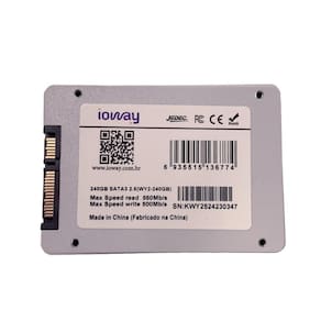 SSD 240GB Ioway de alto desempenho. Aumente muito a capacidade do seu sistema, alcançando velocidades de leitura e gravação de até 560 MB/s e 500 MB/s, respectivamente. Este produto conta com uma interface SATAIII, que é responsável pela transferência eficiente de dados com a placa-mãe do seu computador. Sua alta velocidade de envio de informação é de extrema importância, proporcionando um significativo aprimoramento no desemprenho do sistema.Especificações TécnicasCapacidade de armazenamento: 240GBVelocidade de leitura e gravação: 560MB/s X 500MB/sInterface: SATA3Formato físico: 2,5MTBF Mean Time Between Failures : 1000000HVida útil TBW - Total Bytes Written 160TBGarantia: 3 anosTamanho: 145x90x17mmPeso: 45g Marca: Não Informado