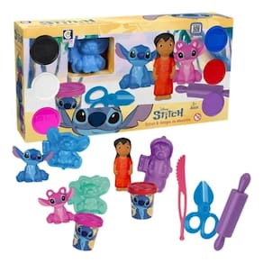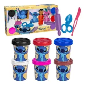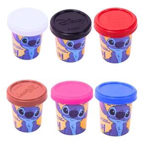 Este kit incrível vem composto por 6 potes de massinha de 60g cada, em cores vibrantes e textura macia, fáceis de modelar (azul, rosa, lilás, verde, amarelo e laranja), além de 3 moldes personalizados: Stitch, Angel e Lilo modelinhos super fofos para estimular o faz-de-conta.