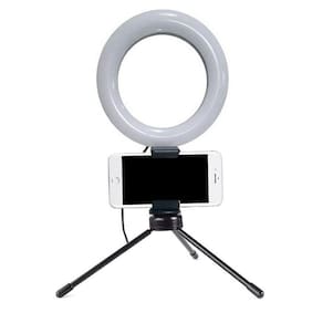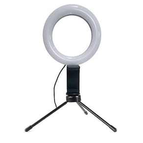 STO309 - Iluminador Ring Light 16cm Usb Led Misto 3500k 5500k Tripe Iluminador Ring Light de 16 cm com Suporte para Celular Desenvolvido para maquiadores, fotos e filmagensVocê pode ajustar o ângulo da iluminação por possuir um suporte articulado. É possível controlar as diferentes temperaturas de cores através do controle de ajuste que vai de 3200k à 5500k. Na frente dos leds tem um filtro difusor para suavizar a luz espalhando a luz com maior uniformidade.A alimentação do iluminador é através de cabo USB não acompanha adaptador de tomada e não possui bateria interna recarregável , você pode utilizar um adaptador de tomada de celular para ligar ou conectar no USB do computador ou outro equipamento que forneça 5v USB. O cabo USB deverá estar sempre ligado para funcionar.O encaixe do Ring ligth é através de encaixe padrão de tripés de rosca. O mini tripé também serve para utilizar em outros equipamentos de até 1kg de peso, como projetores, celulares e etc.É recomendado e extremamente eficaz para a macro fotografia, fotografia médica, odontológica, científica, hobby e para a iluminação/fotografia de produções de maquiadores.Fácil de usar, durável e de pouco peso, facilitando o transporte.Especificações: