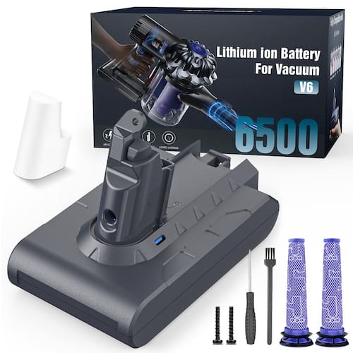 - MAIS POTÊNCIA, MAIS DURABILIDADE: A bateria de substituição ultralongada para V6 atende às necessidades de limpeza profunda de sua sala grande. A bateria de 6500mAh para a série V6 está equipada com um chip de bateria premium atualizado, portanto, tem maior duração e carregamento mais rápido